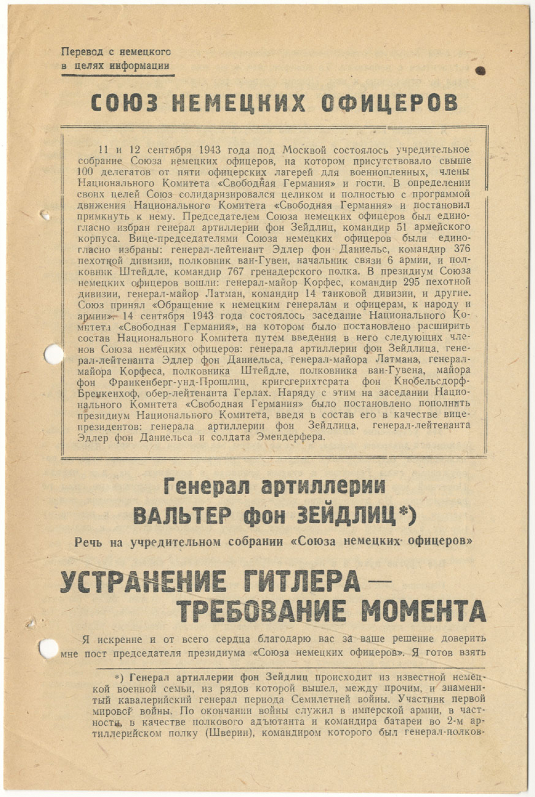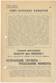 Bund deutscher Offiziere / Nationalkomitee freies Deutschland, General der Artillerie Walther von Seydlitz, Flugblatt von der Sowjetischen Armee ab dem 30. 9. 1943 über der deutschen Ostfront abgeworfen, dazu die amtliche, gedruckte Übersetzung für sowjetische Behörden