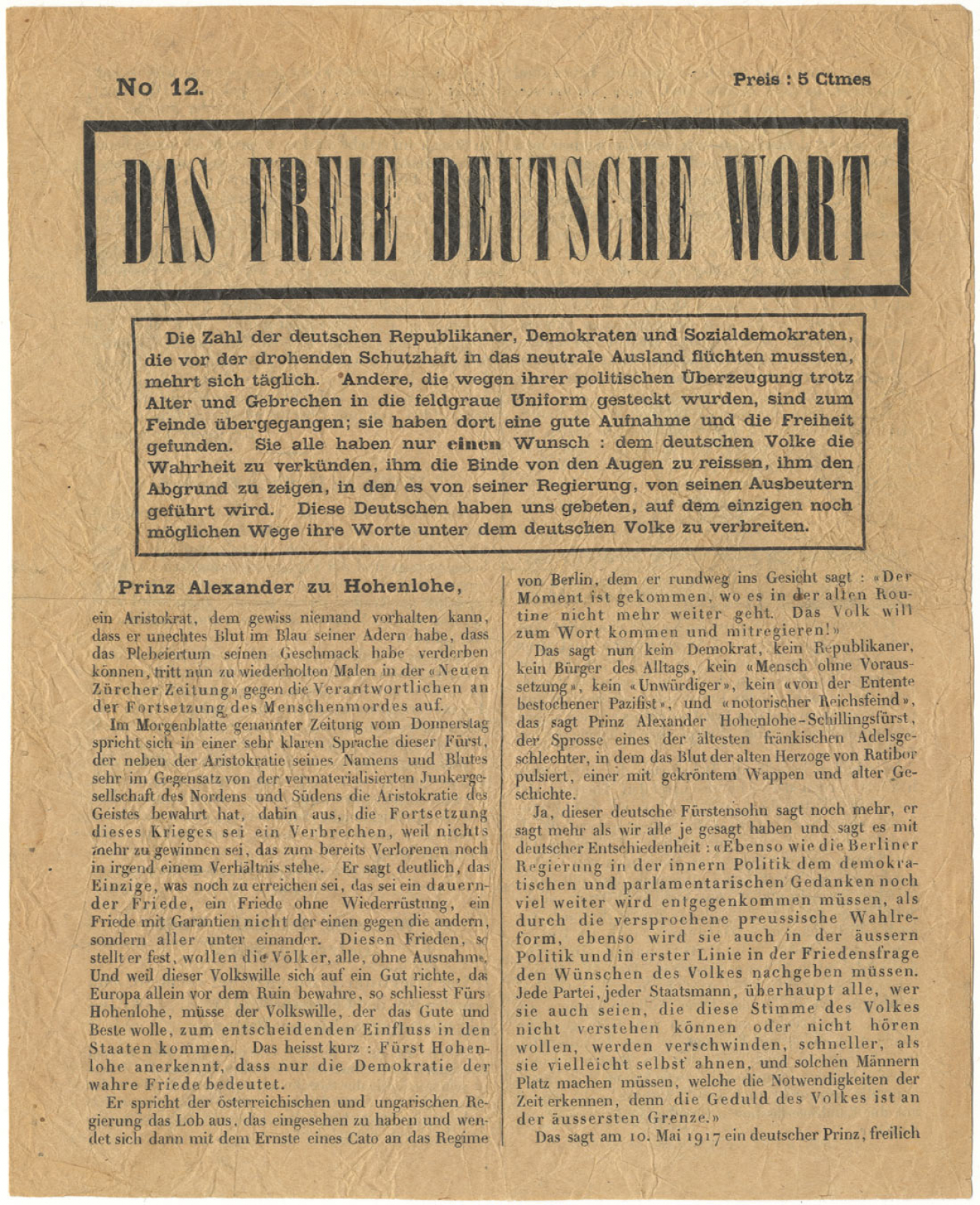 Das freie deutsche Wort, No. 12, französisches Flugblatt / Feindpropganda aus dem ersten Weltkrieg, Juli 1917