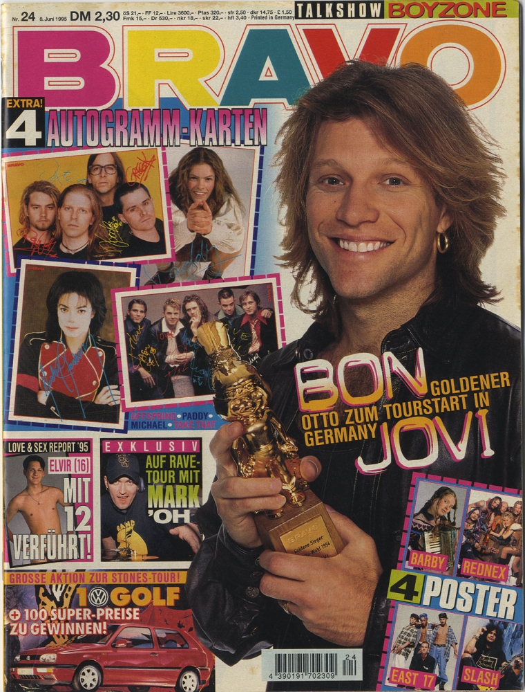 Bravo, 1995 Nr. 24, Barby Kelly Poster, Rednex, East 17, Slash, Bon Jovi, Michael Jackson, Offspring, Rolling Stones, Boyzone, Scooter, u.a.